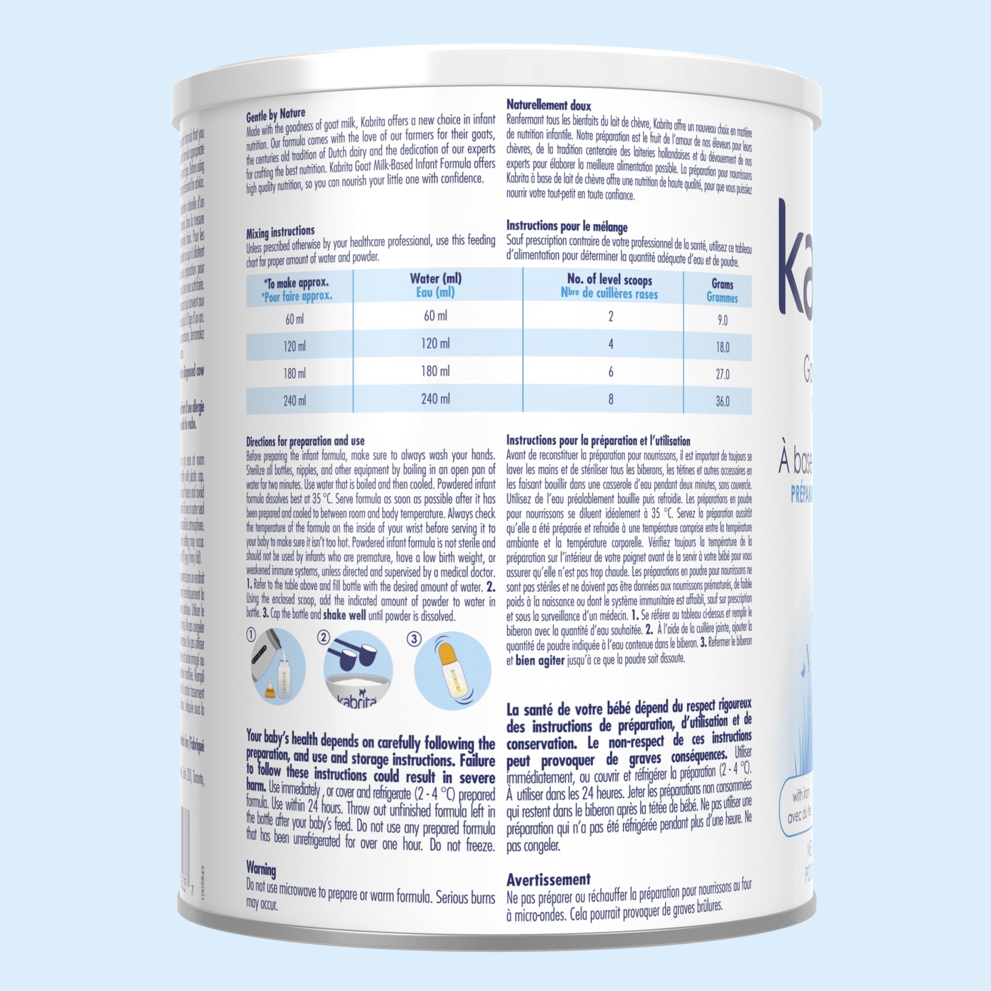 Making the switch to Kabrita Goat Milk-Based Infant Formula is gentle and easy! As you are introducing the formula you may notice a change in your baby's stool frequency, colour, and consistency, and that's okay! No worries. There is no need to gradually add it to your baby's diet over a period of days or in increasing amounts, especially if you are trying a new formula because your baby was having trouble tolerating the previous formula. Always consult with your baby's healthcare provider to review your little one’s unique needs and the available feeding options.