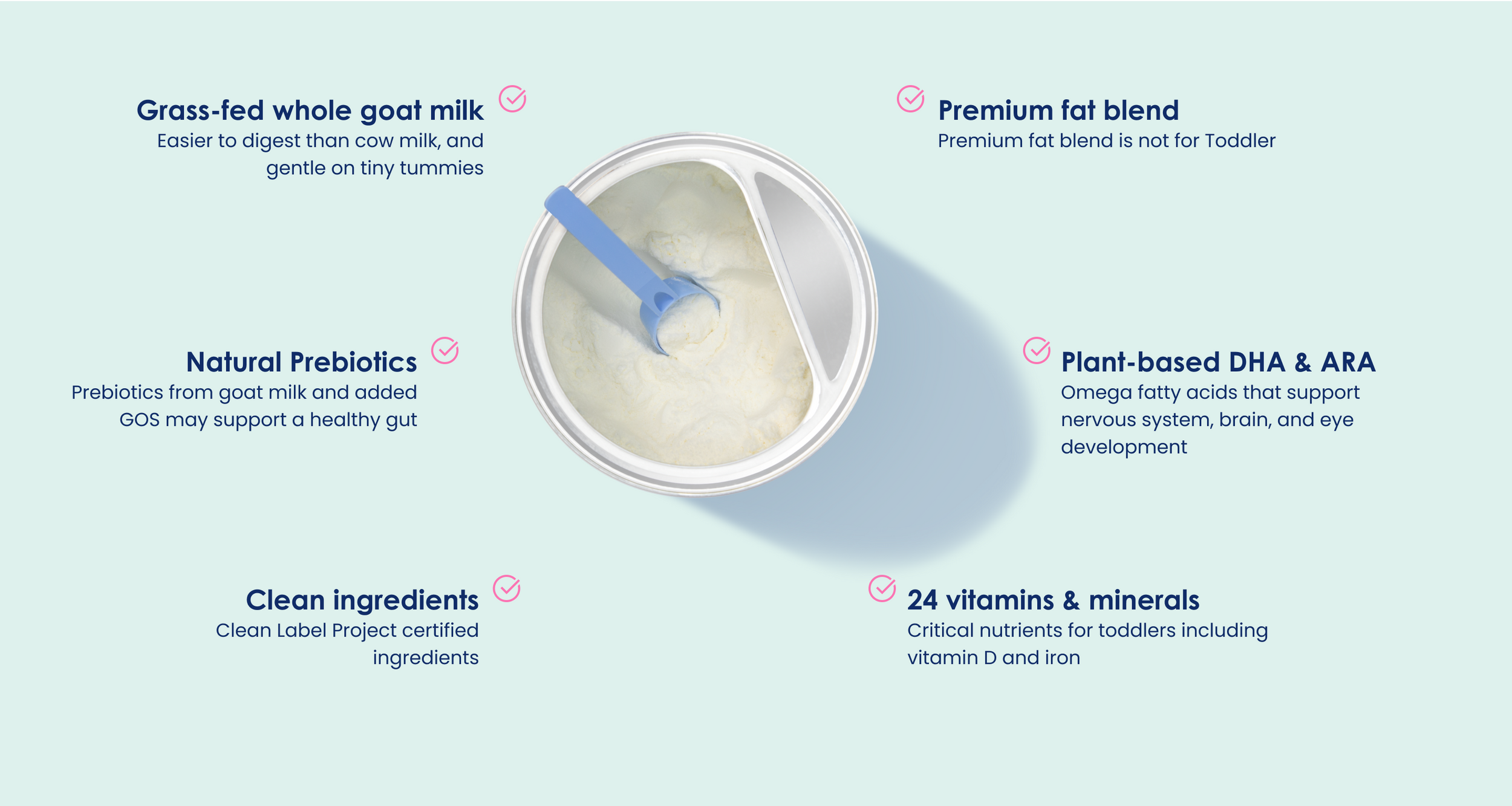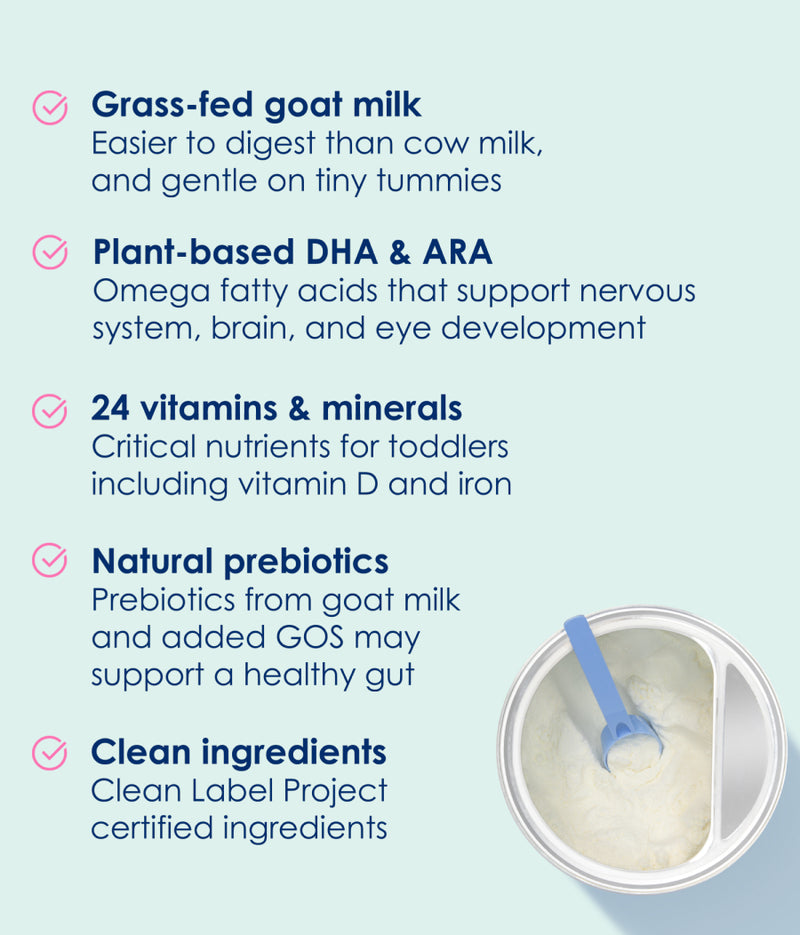 We use premium, whole-fat European goat milk that is naturally gentle and easy to digest. It contains the nutrients toddlers need for healthy growth and development, without the bad stuff like GMOs, antibiotics, or pesticides. Kabrita Toddler Nutrition also supports a healthy gut, immunity, and brain development.